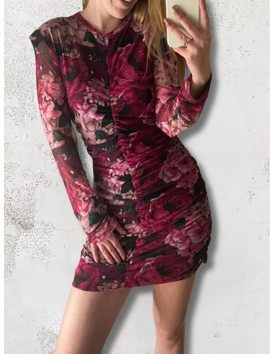 WP sukienka mini z siateczki w kwiaty - bordowa