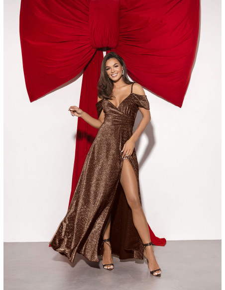 Brokatowa sukienka maxi na ramiączkach STELLA - czekoladowa