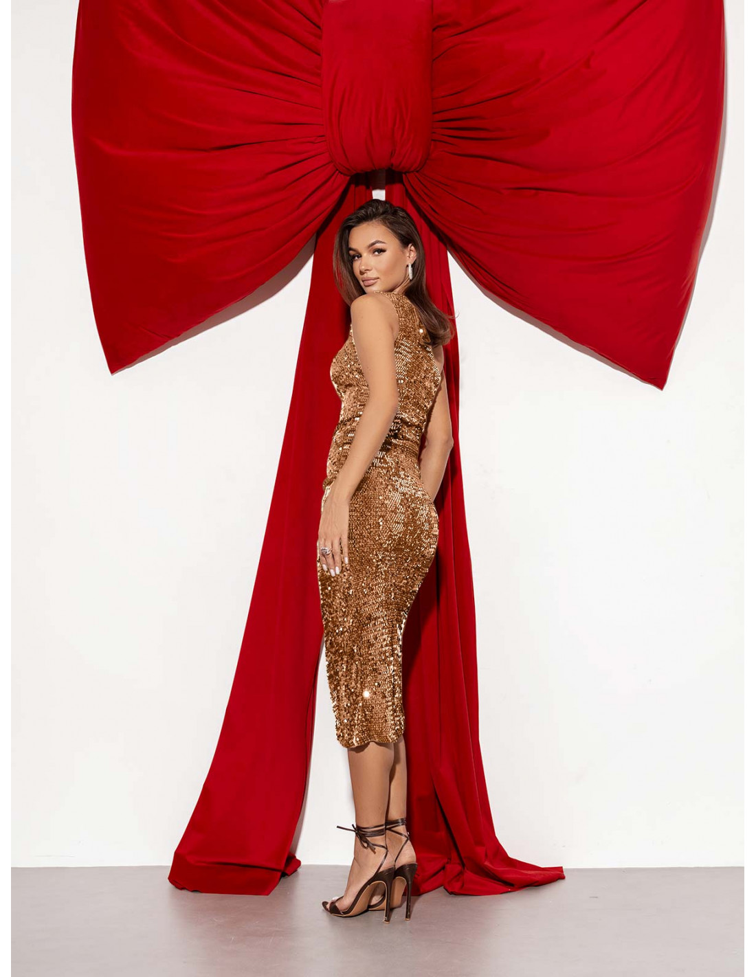 W tej złotej sukience naprawdę błyszczysz – bez zbędnych dodatków.