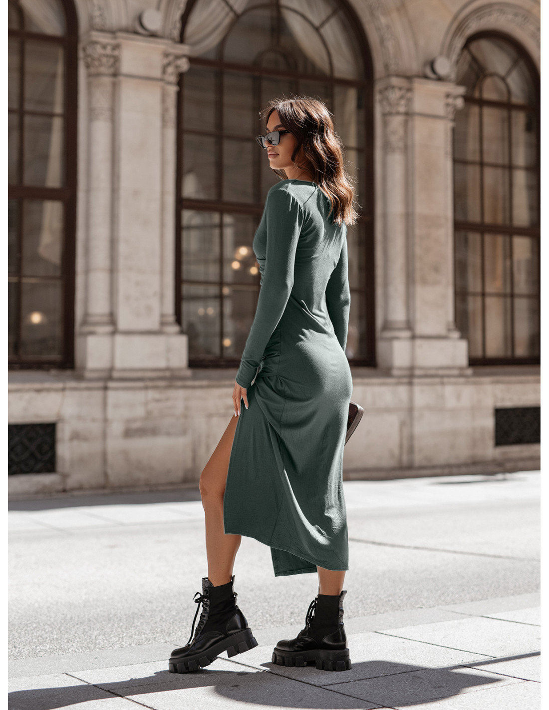 Efektowne drapowanie w talii optycznie wysmukla, a wysokie rozcięcie na nodze dodaje całości pazura i zmysłowości.