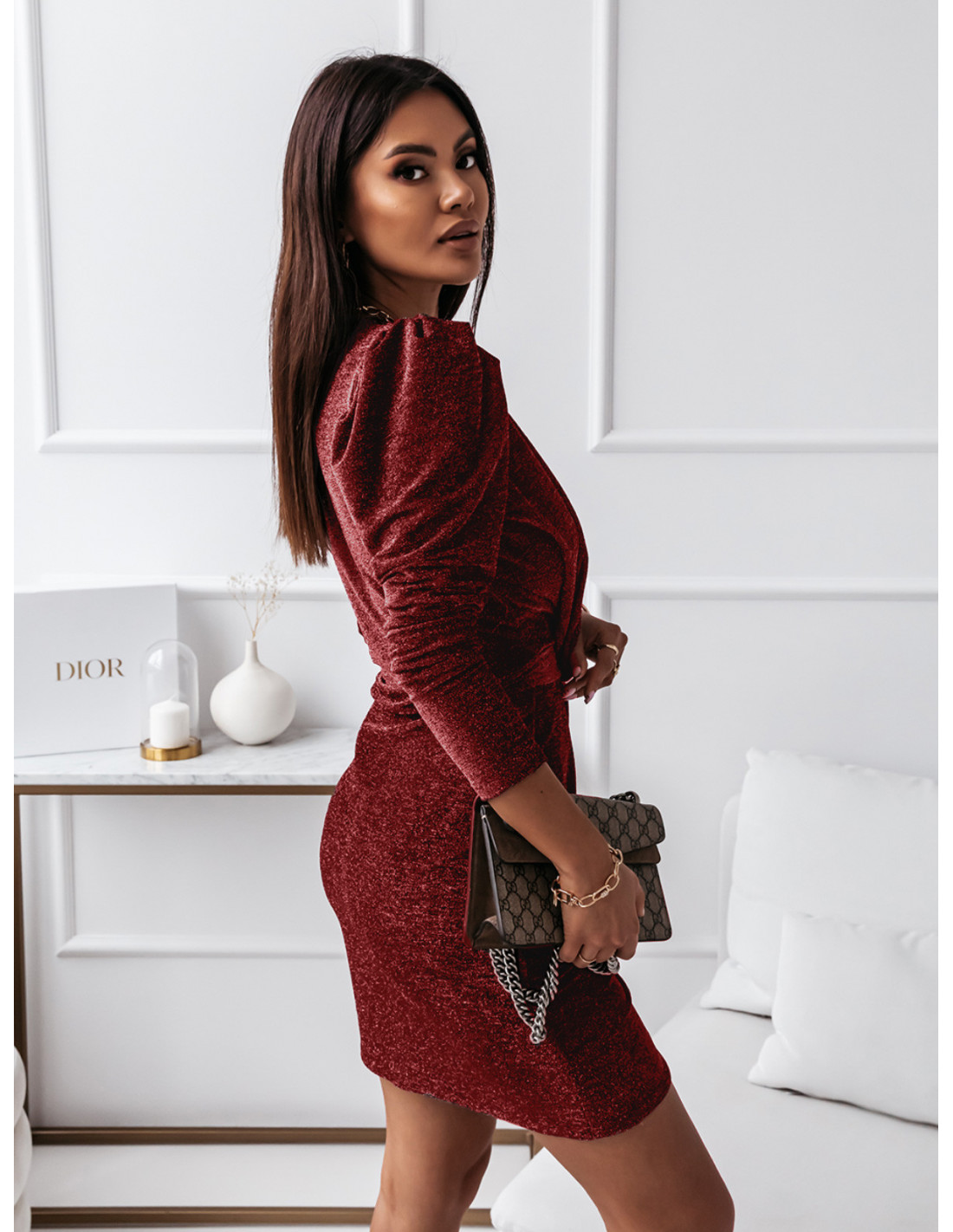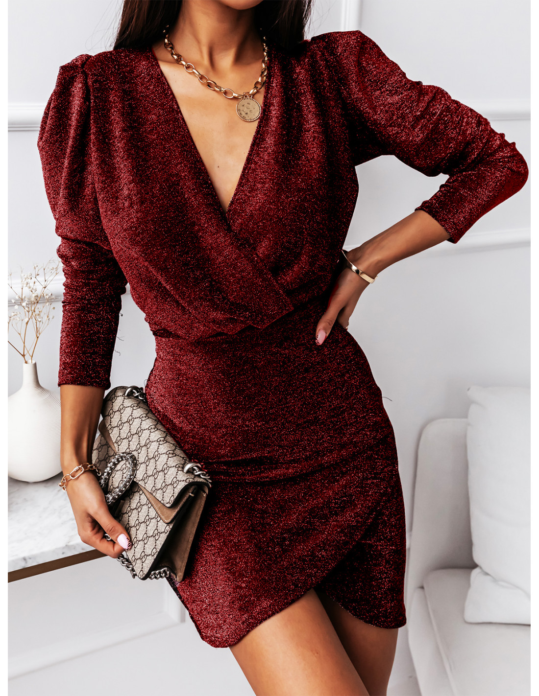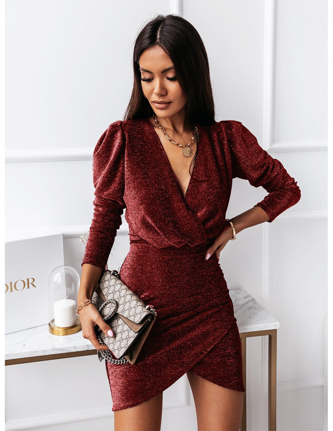 Brokatowa sukienka z kopertowym dekoltem i bufiastymi rękawami to prawdziwy HIT i koniecznie postaw na nią w tym sezonie!