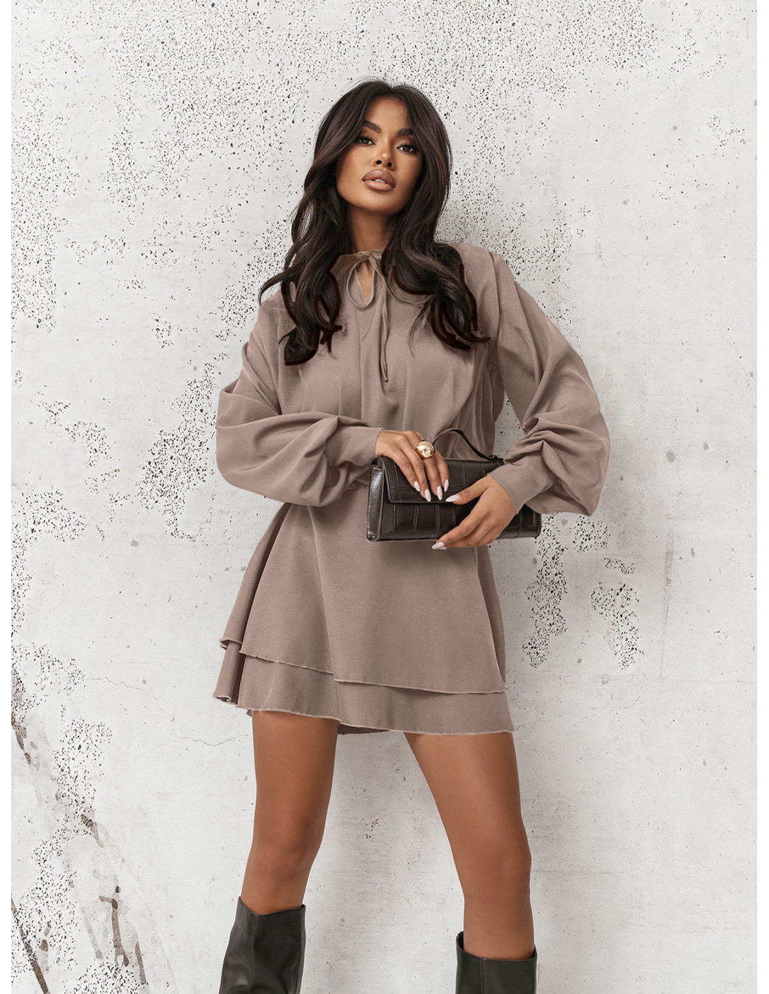 Rozkloszowana sukienka mini w kolorze mocha mousse koniecznie musi zagościć w Twojej garderobie.