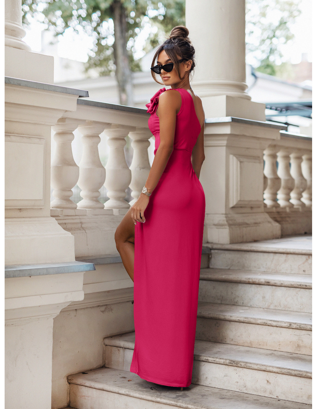 WP dopasowana maxi sukienka na jedno ramię - fuksjowa