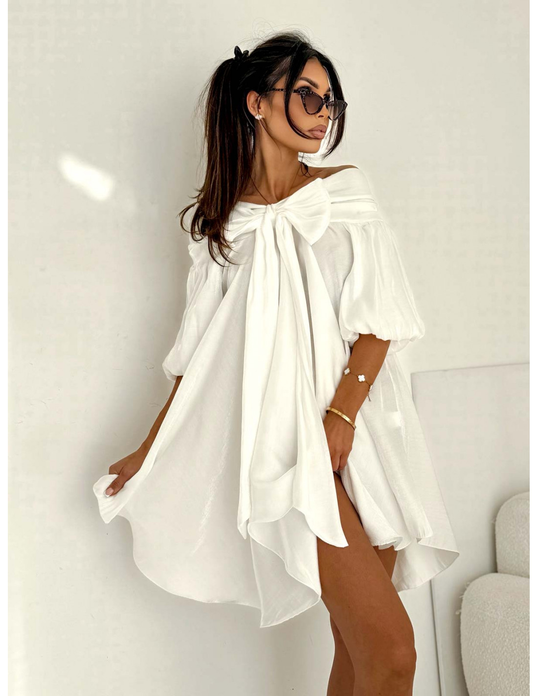 Spektakularna kokarda przy dekolcie przyciąga spojrzenia i nadaje stylizacji wyjątkowego, modowego akcentu.