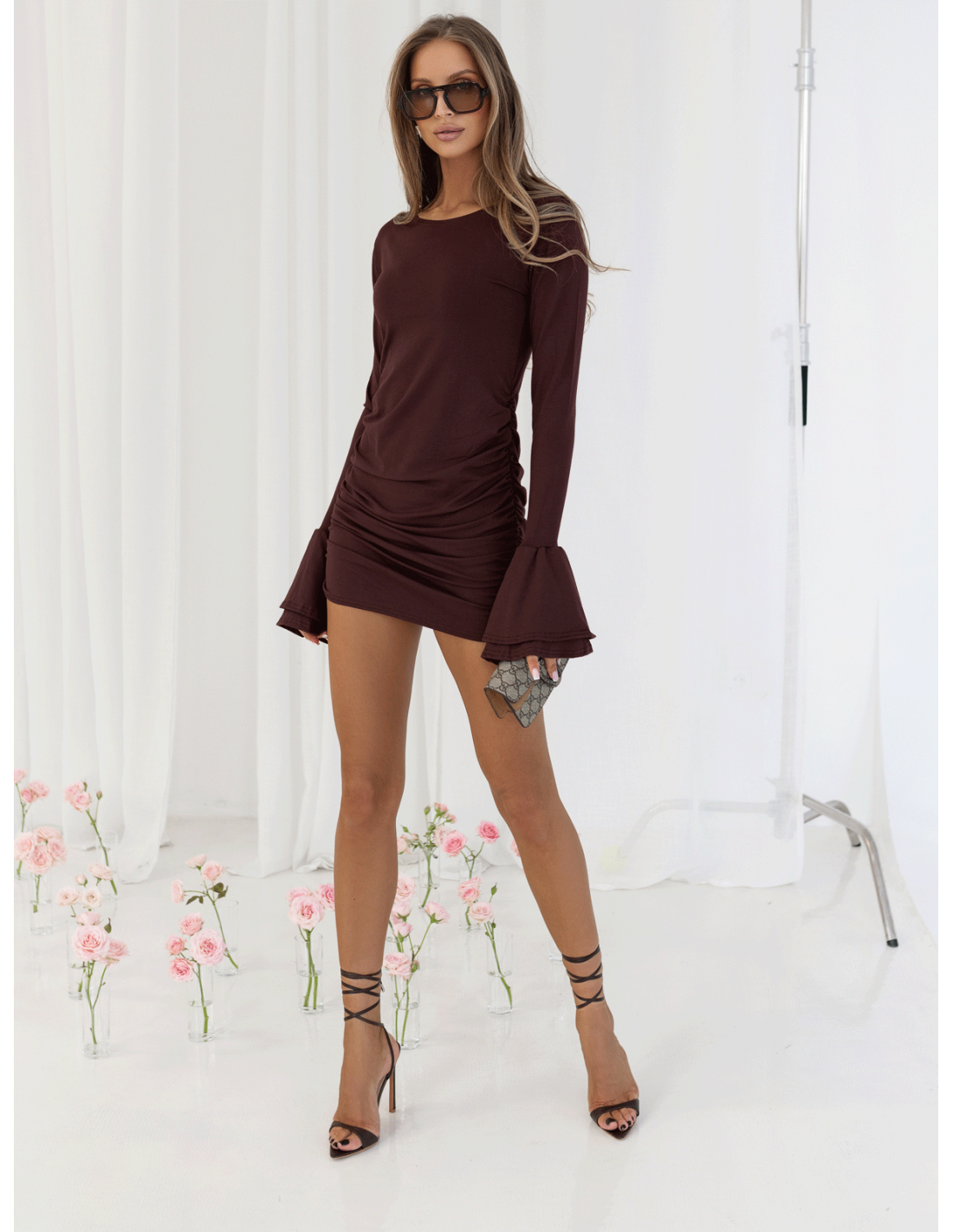 Wiskozowa sukienka mini z szerokimi rękawami ANDREA - czekoladowa