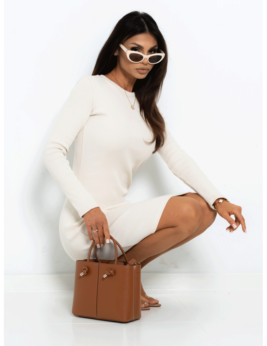 Dopasowana prążkowana sukienka mini LUMIERE - beżowa