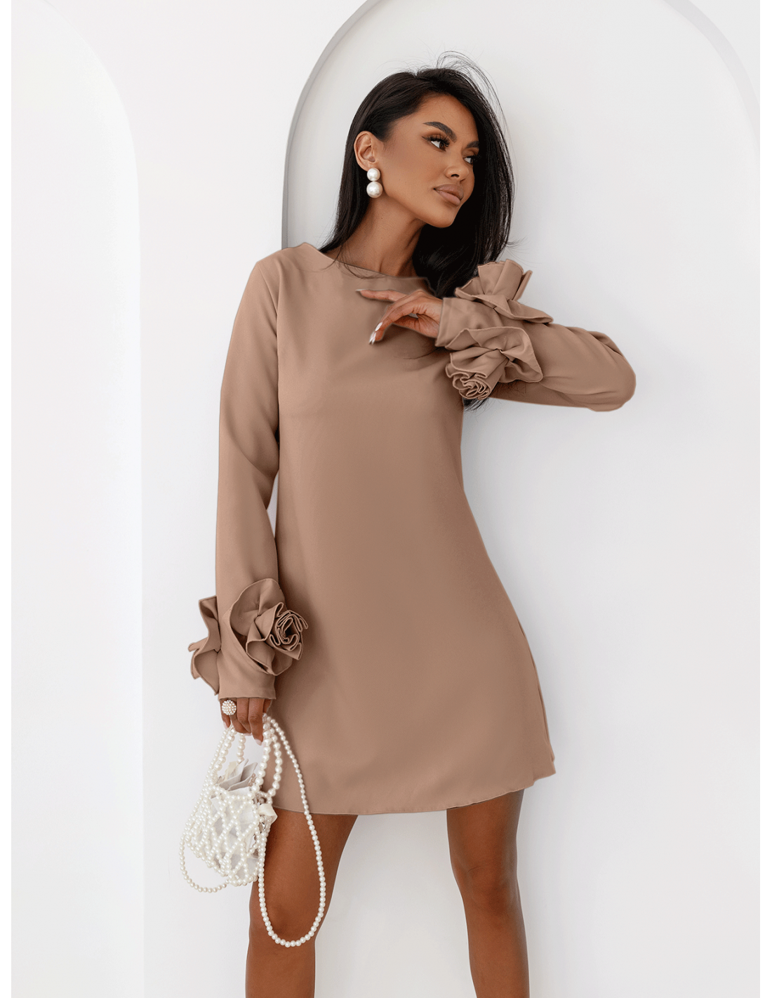 Ta stylowa mini sukienka z długimi rękawami zakończonymi ozdobnymi kwiatami, doskonale podkreśli Twoją figurę, zapewniając wygodę i swobodę ruchów.
