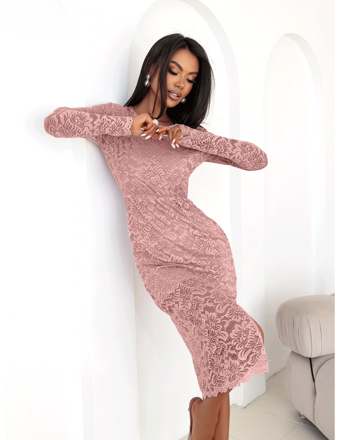 Elegancka koronkowa sukienka midi NILAY - brudny róż
