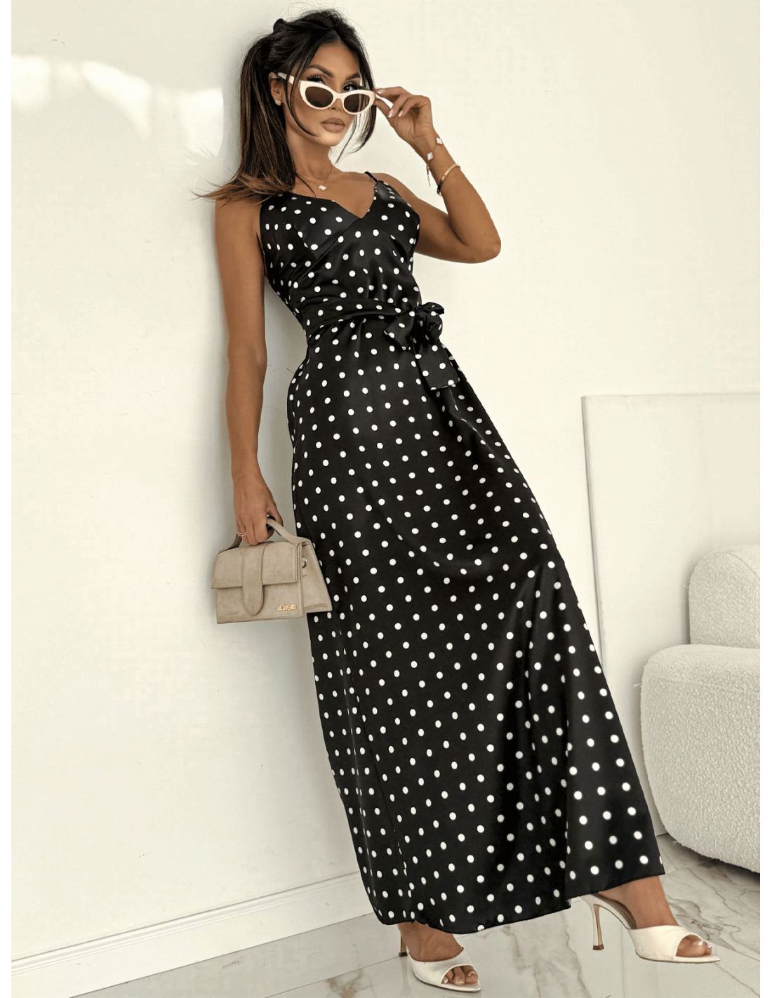 Długość maxi w połączeniu z klasycznym printem w grochy tworzy wyjątkowo stylowy, a jednocześnie lekki look – idealny na przyjęcia, randki czy letnie wyjścia.