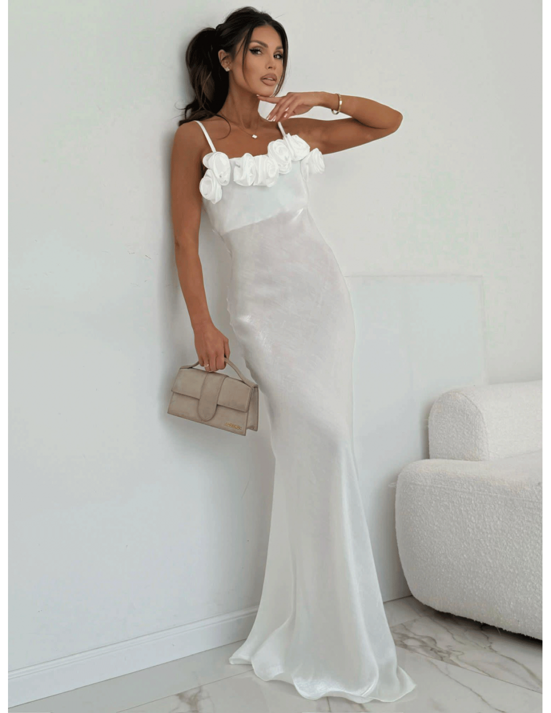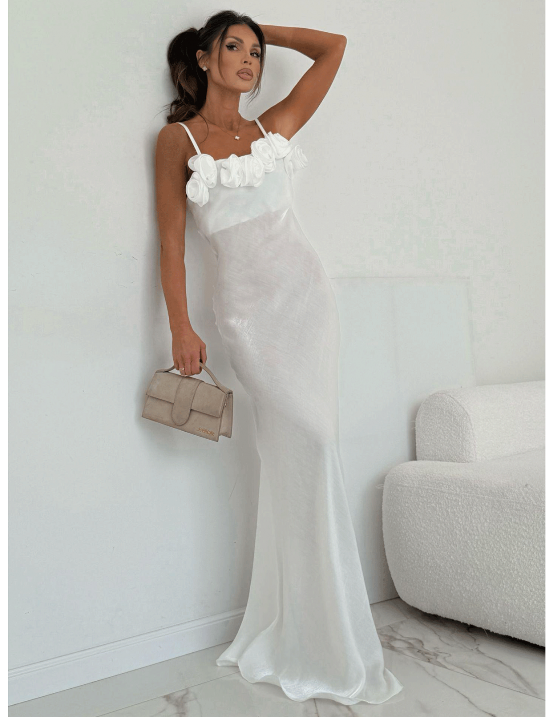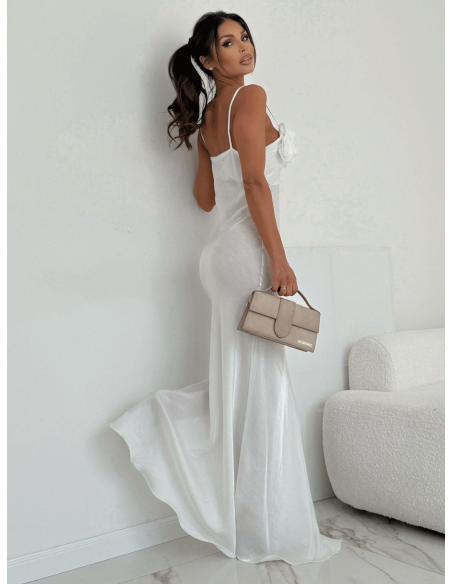 Subtelne ramiączka eksponują ramiona, a ozdobne róże przy dekolcie dodają wyjątkowego, biżuteryjnego akcentu i przyciągają spojrzenia.