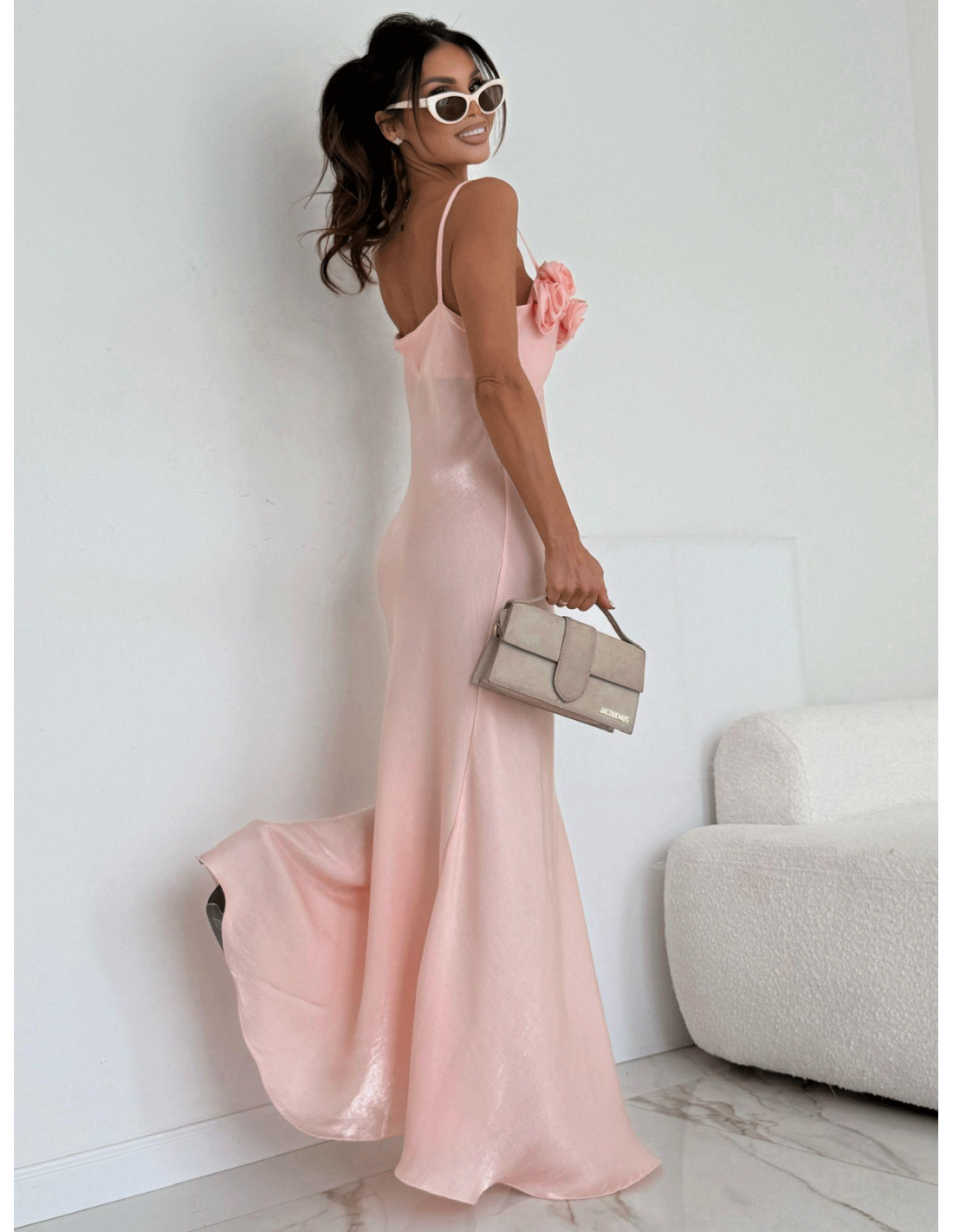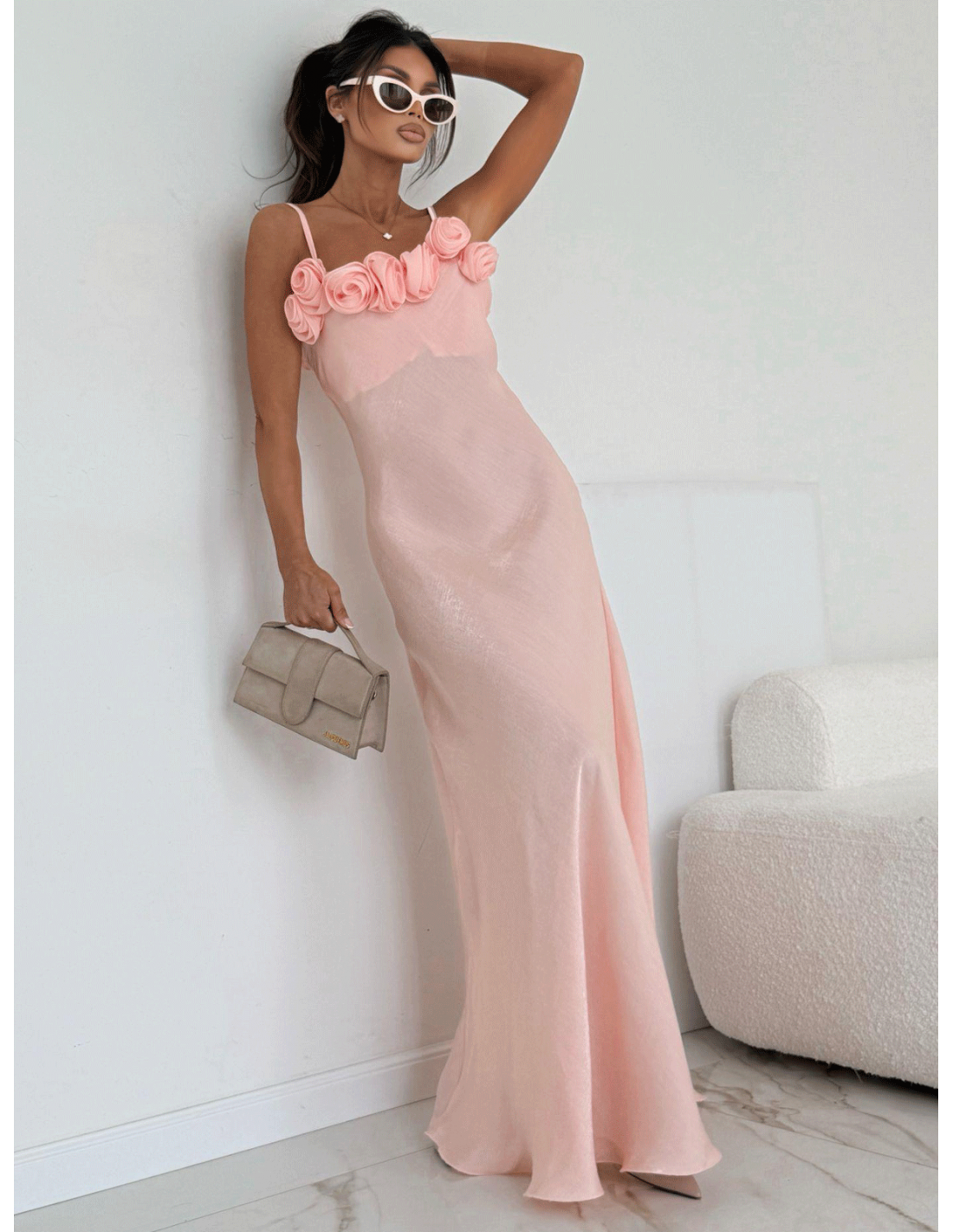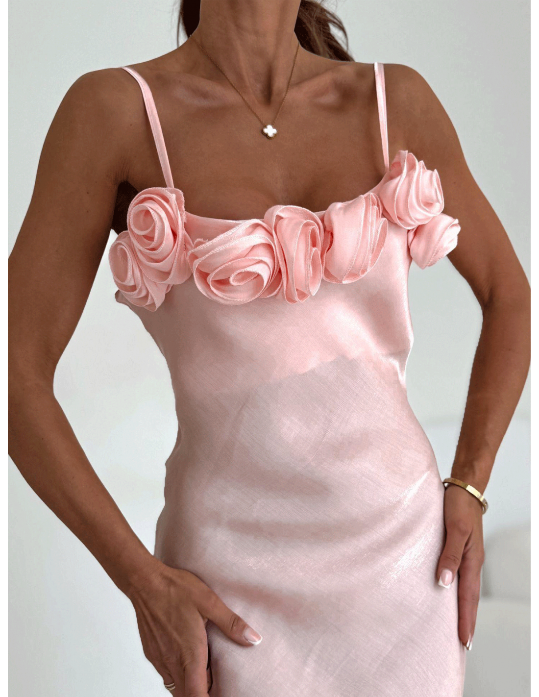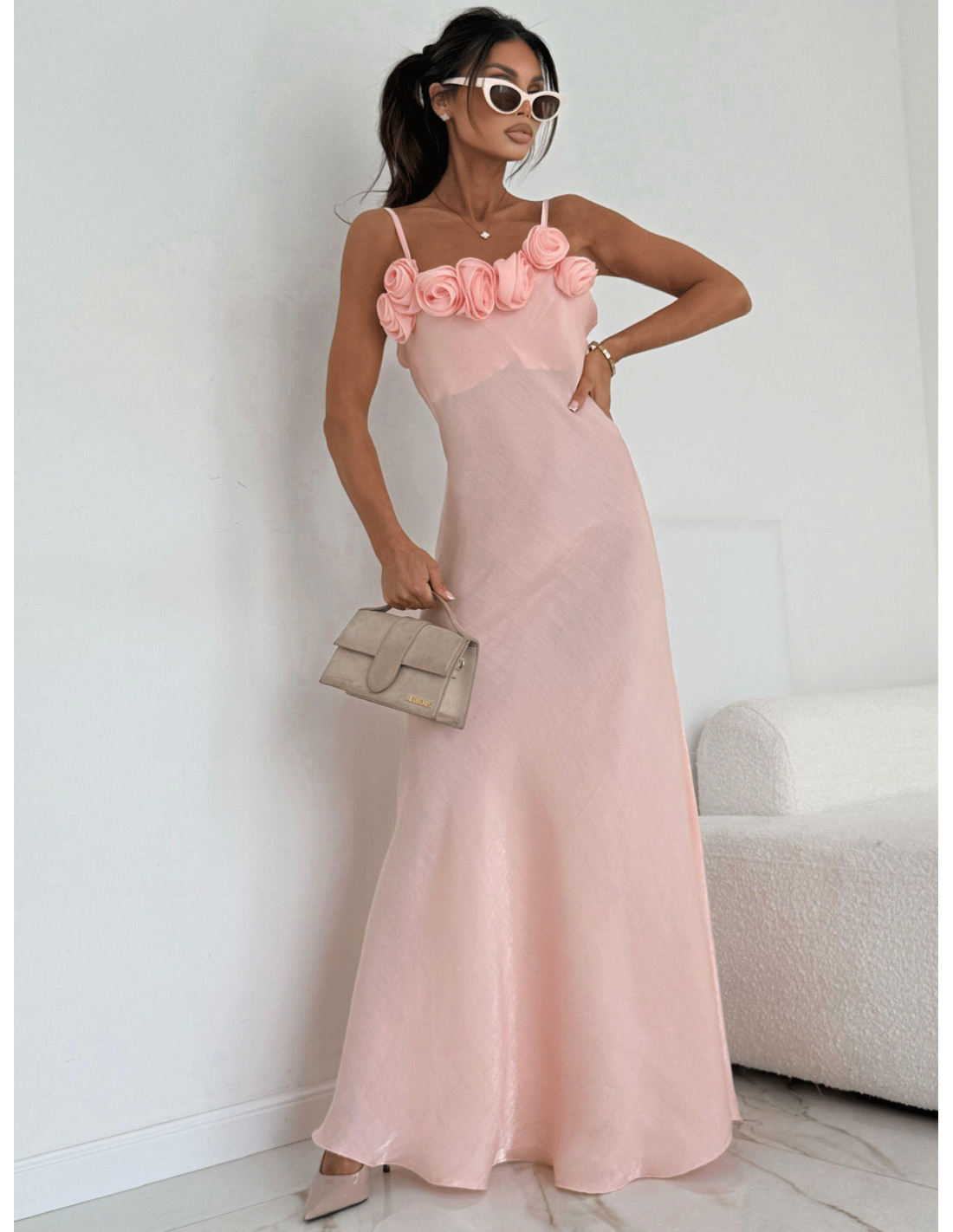 Subtelne ramiączka eksponują ramiona, a ozdobne róże przy dekolcie dodają wyjątkowego, biżuteryjnego akcentu i przyciągają spojrzenia.