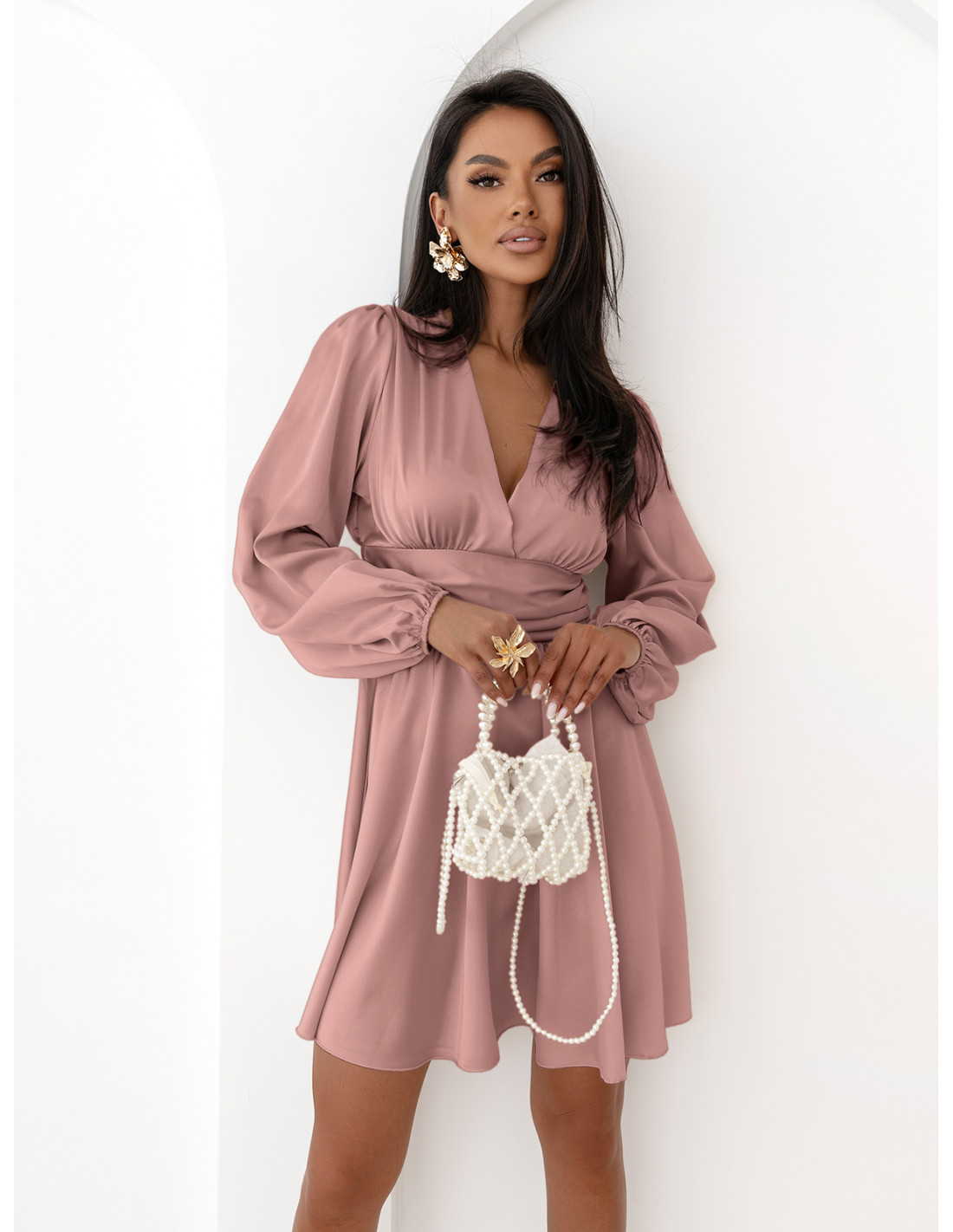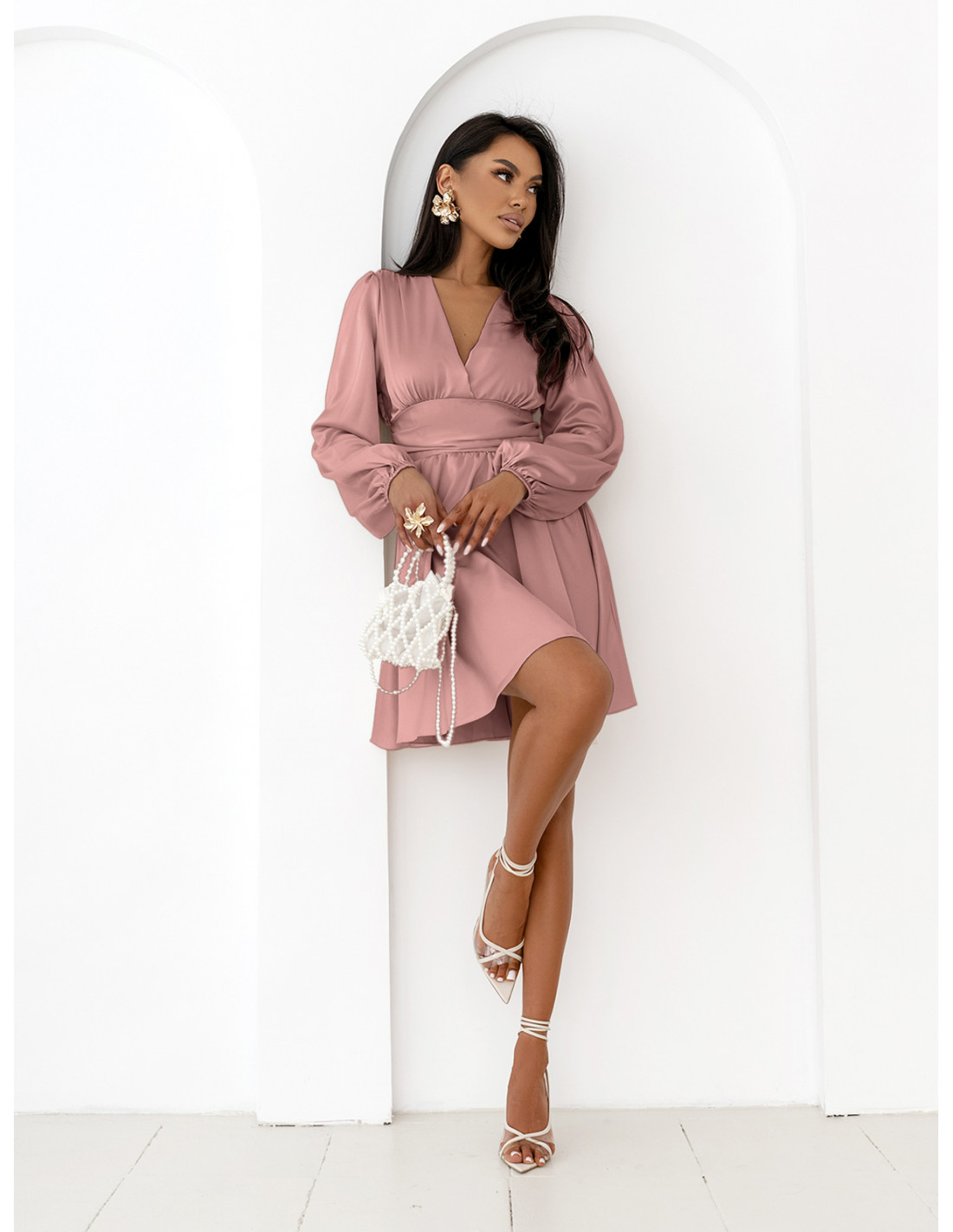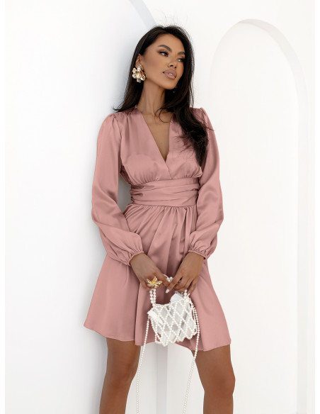 Rozkloszowana satynowa sukienka mini ALDANA - brudny róż