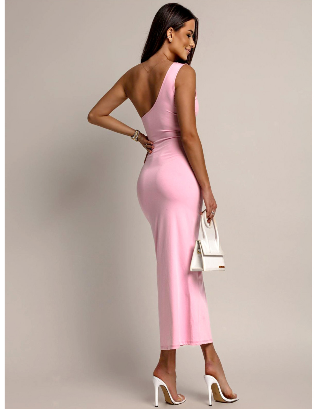 Asymetryczna sukienka z wycięciem VESITA - pudrowy róż