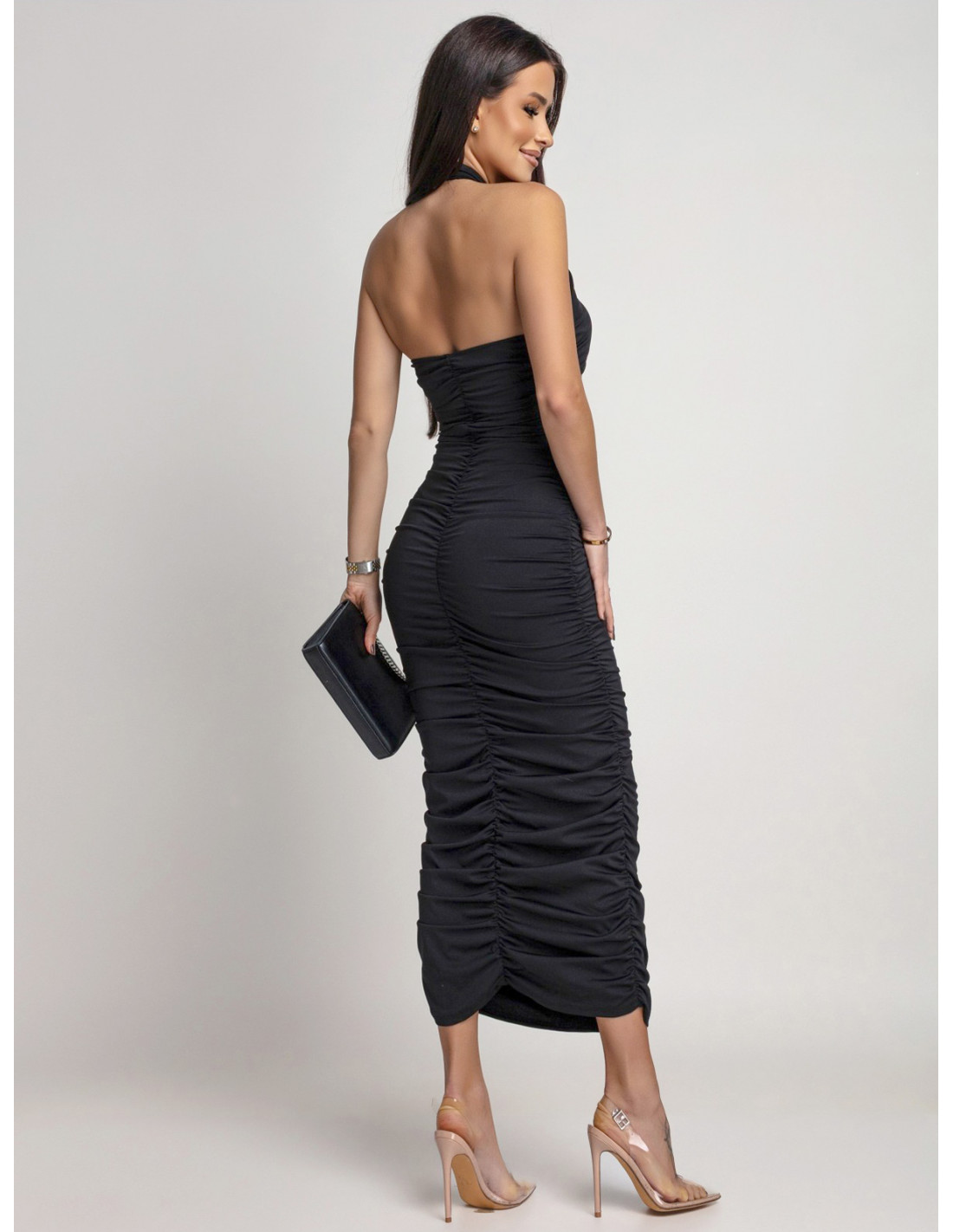 Efektowne marszczenia na całej długości modelują figurę i dodają stylizacji charakteru.