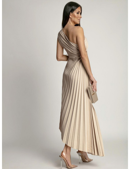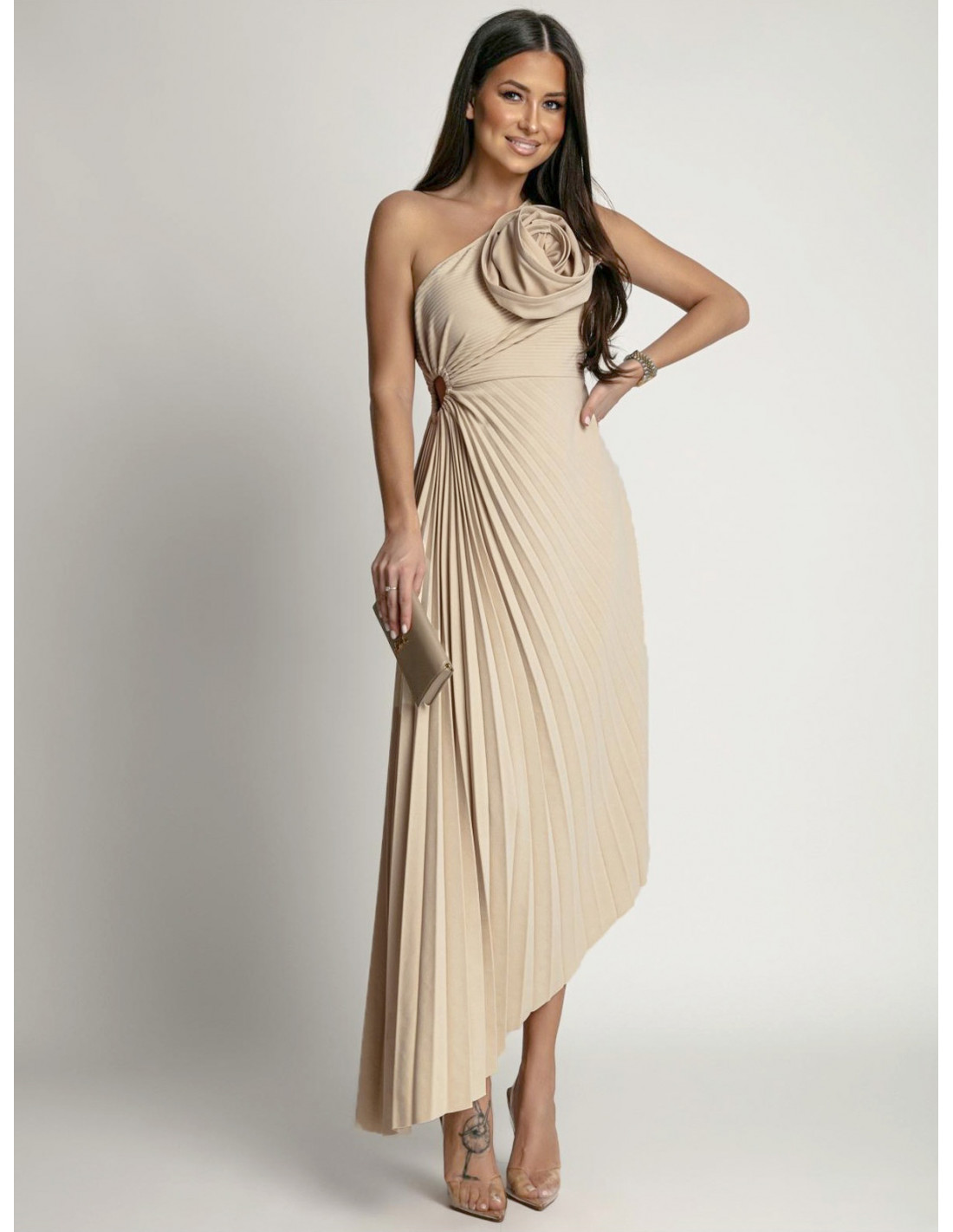 Asymetryczna plisowana sukienka z kwiatem JANNA - beżowa