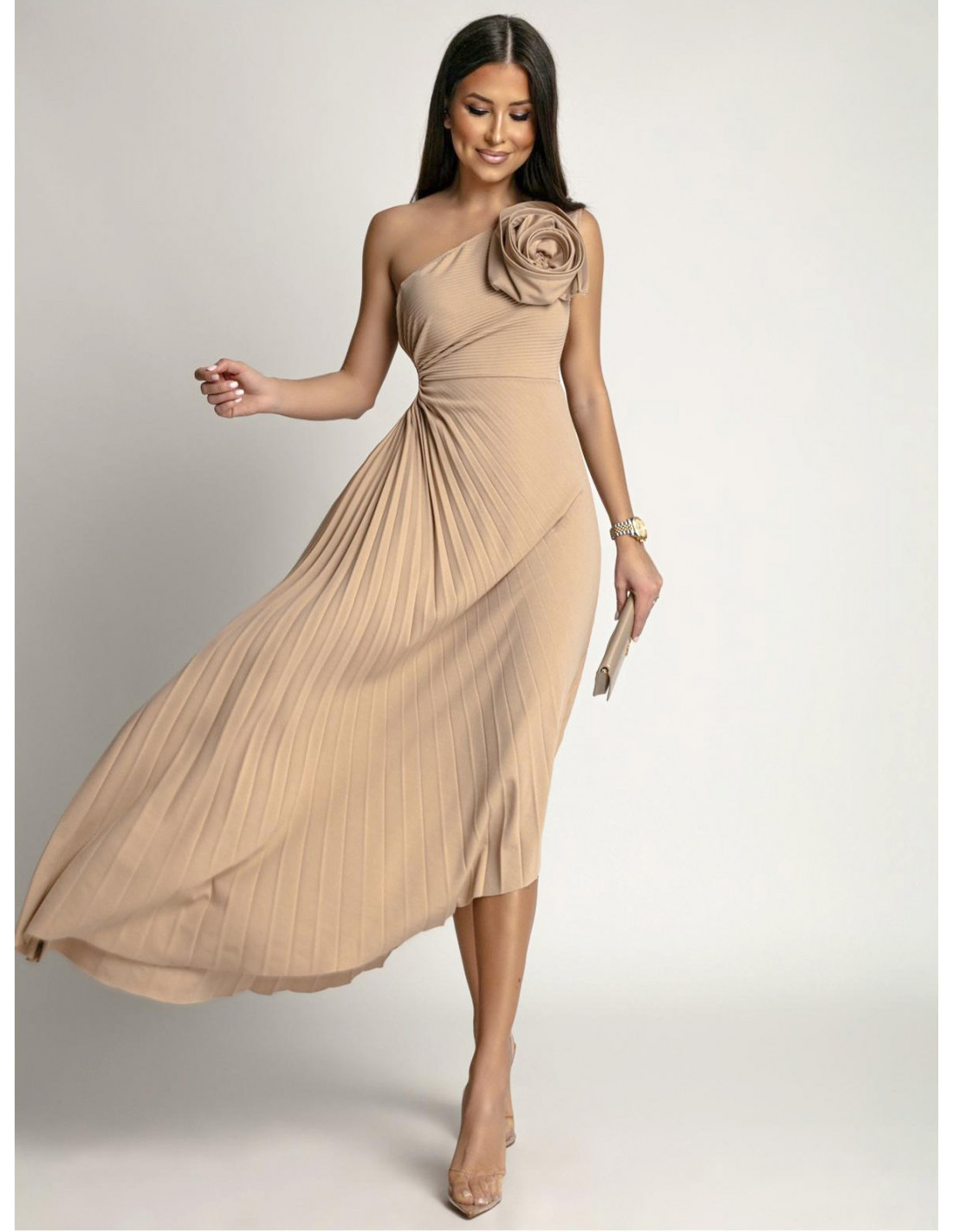 Asymetryczna plisowana sukienka z kwiatem JANNA - cappuccino