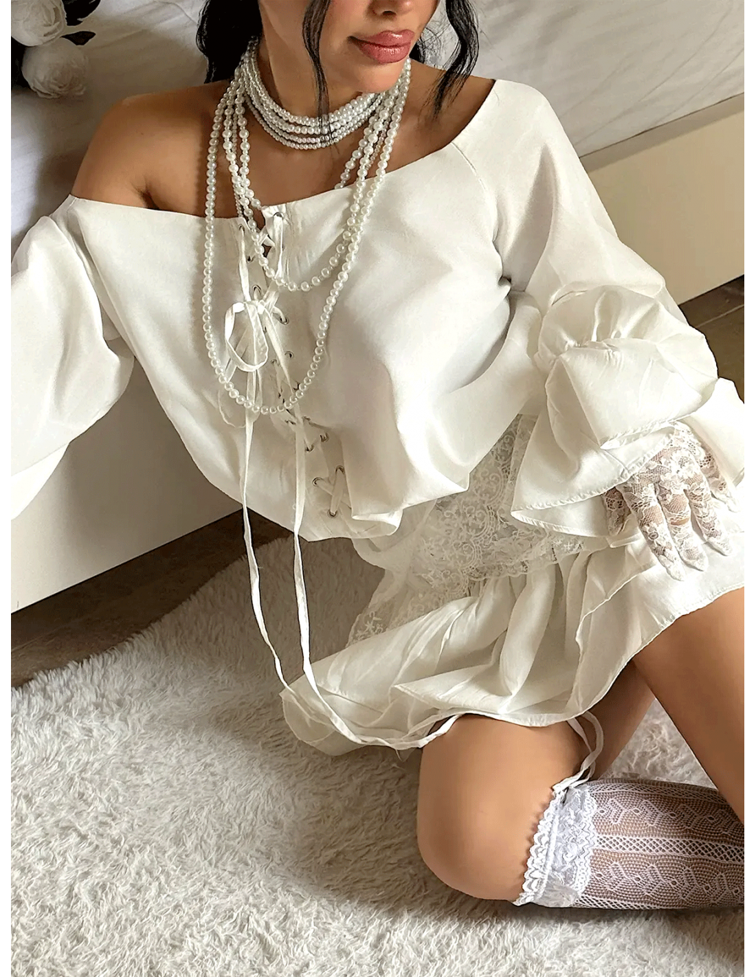 Gorsetowe wiązanie pięknie modeluje sylwetkę, podkreślając talię i nadając całości kobiecego charakteru.