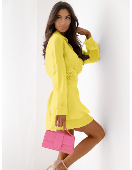 Koszulowa góra zapinana na guziki wprowadza klasyczny akcent, a szeroki pas z ozdobnym kwiatem pięknie podkreśla talię i dodaje romantycznego charakteru.