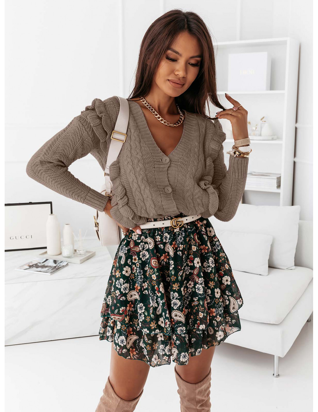 Sweter kardigan z falbanami - GINEVRA - ciemny beż