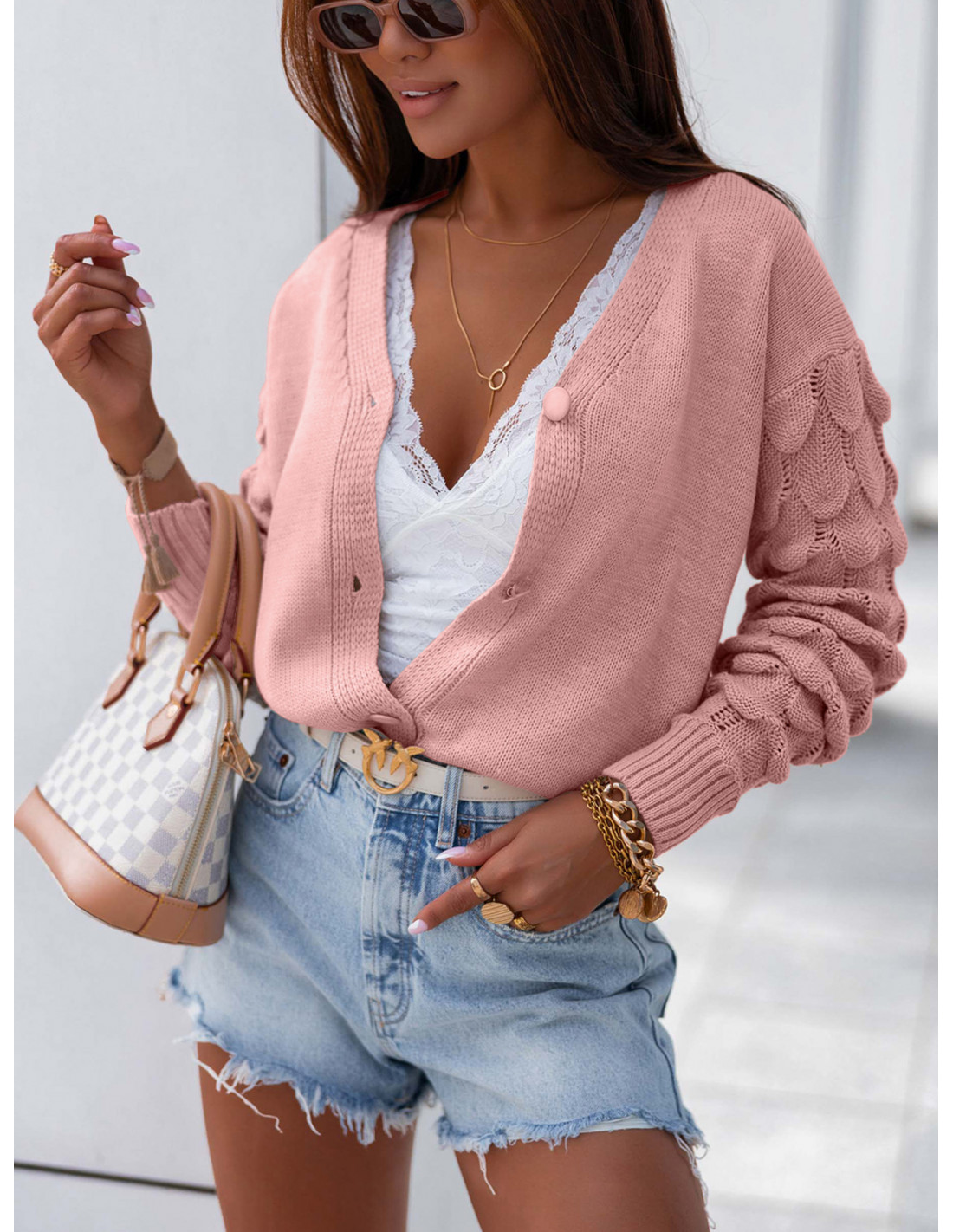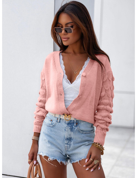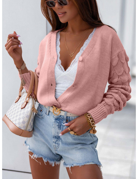 Sweter kardigan z ozdobnym rękawem TRESSI - pudrowy róż
