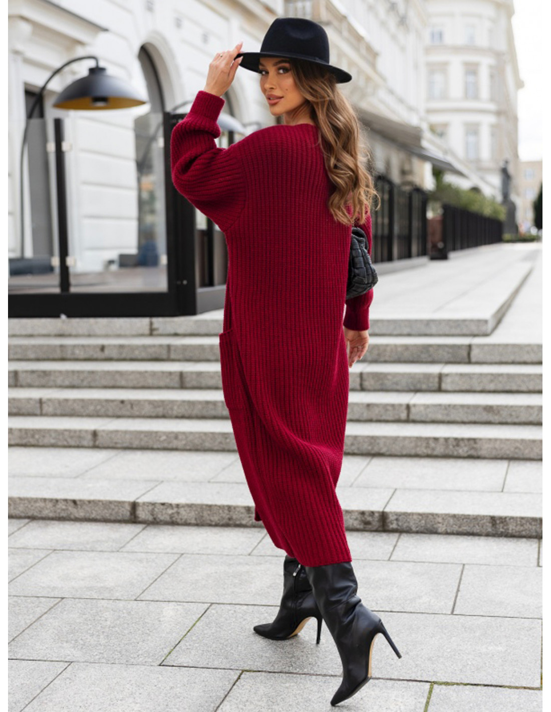 Długi sweter kardigan z kieszeniami HALLI - bordowy