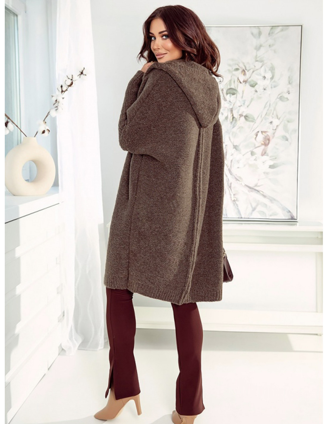 Długi sweter kardigan z kapturem HARIET - czekoladowy