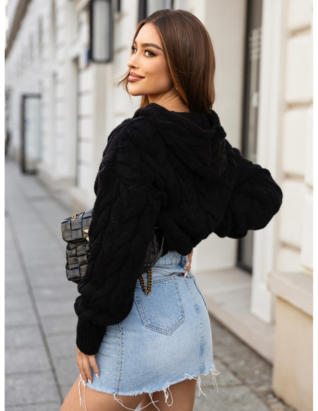 Sweter z kapturem w warkocze ROCCO - czarny