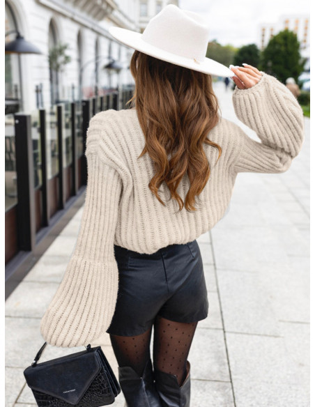 Wyróżnia się modnym, prążkowanym splotem i efektownymi, szerokimi rękawami, które dodają mu charakteru.