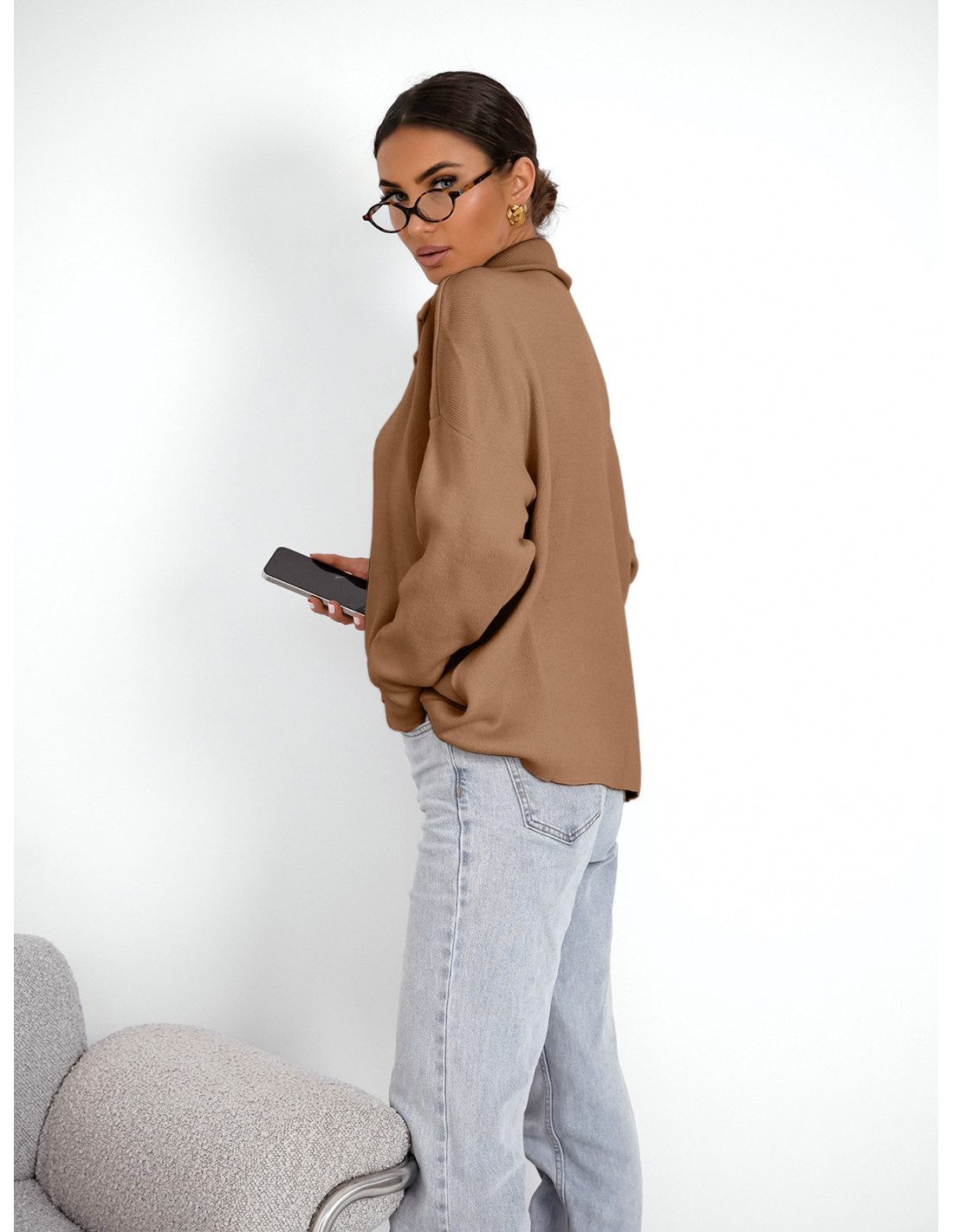 Sweter oversize z zamkiem na dekolcie AYLE - mocha mousse