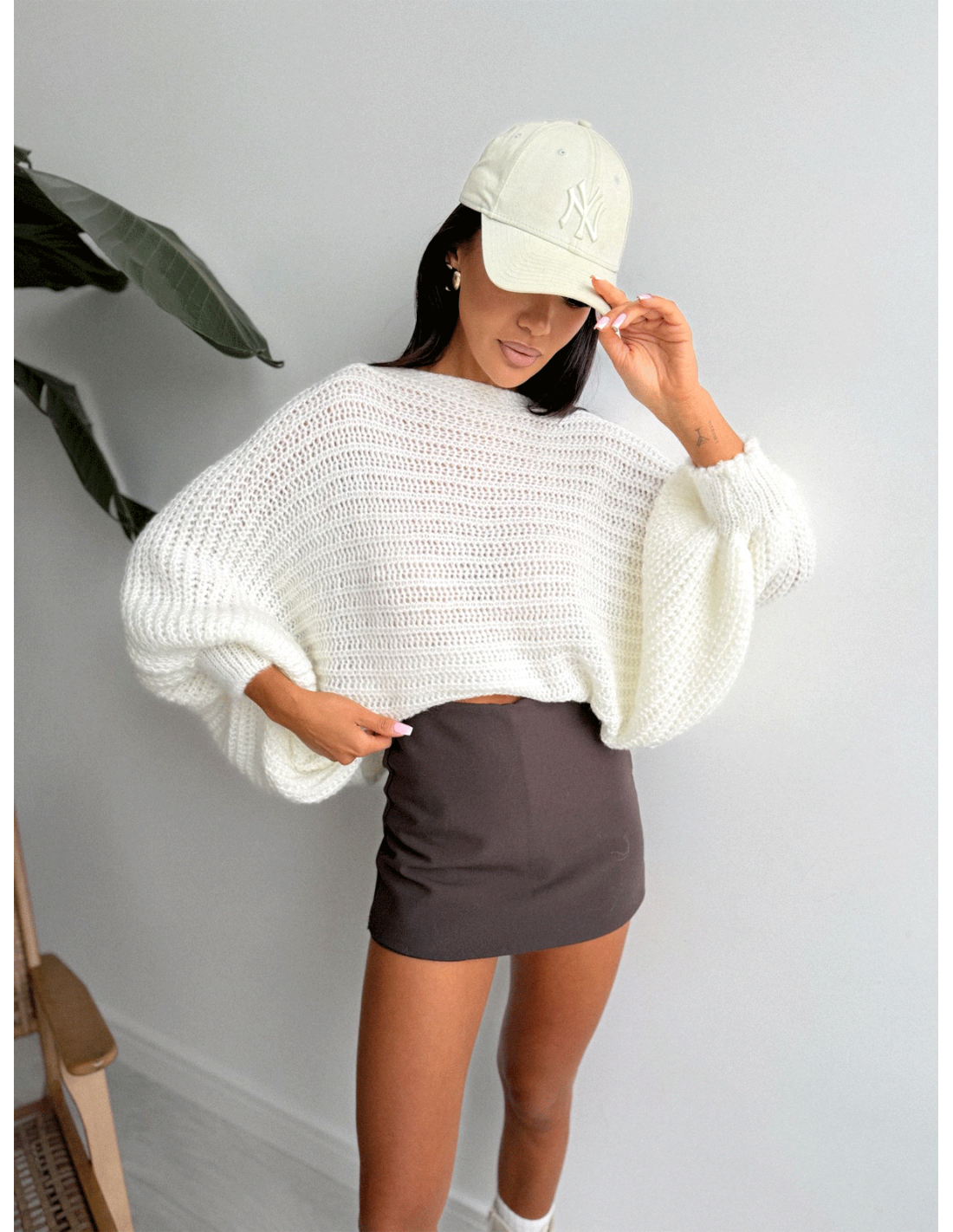 Ten efektowny biały sweter to idealne połączenie kobiecej lekkości i modowego charakteru, które od razu przyciąga spojrzenia.