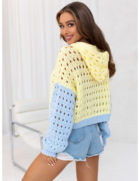 Żółto-błękitny sweter przyciąga spojrzenia i sprawia, że każda stylizacja nabiera modowego charakteru.