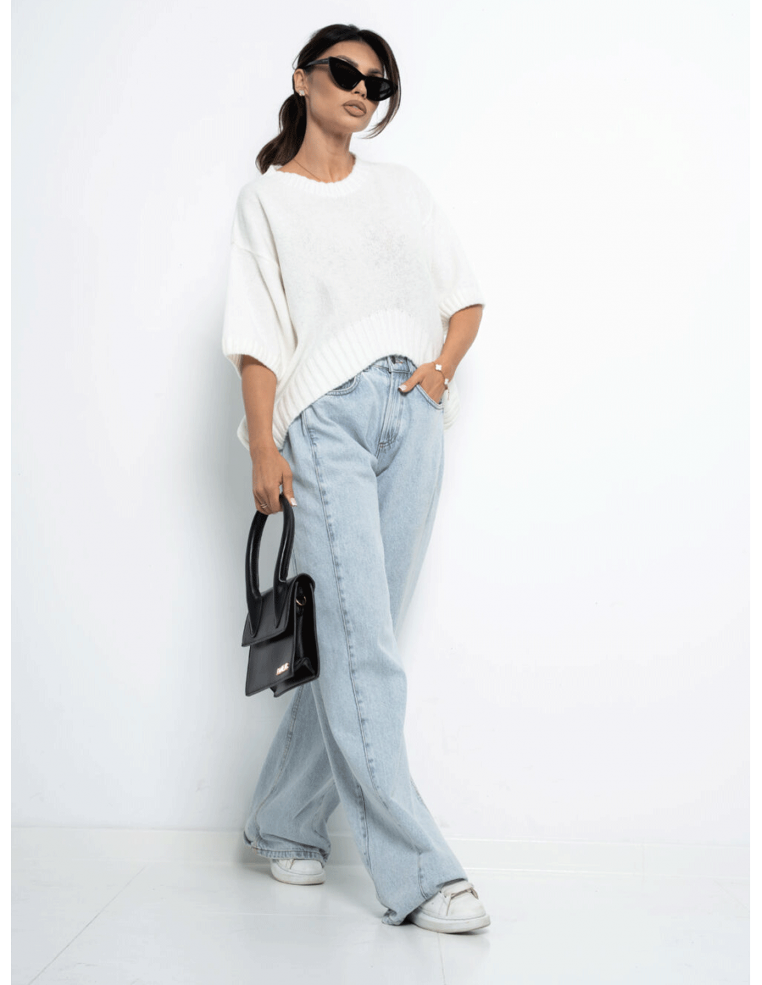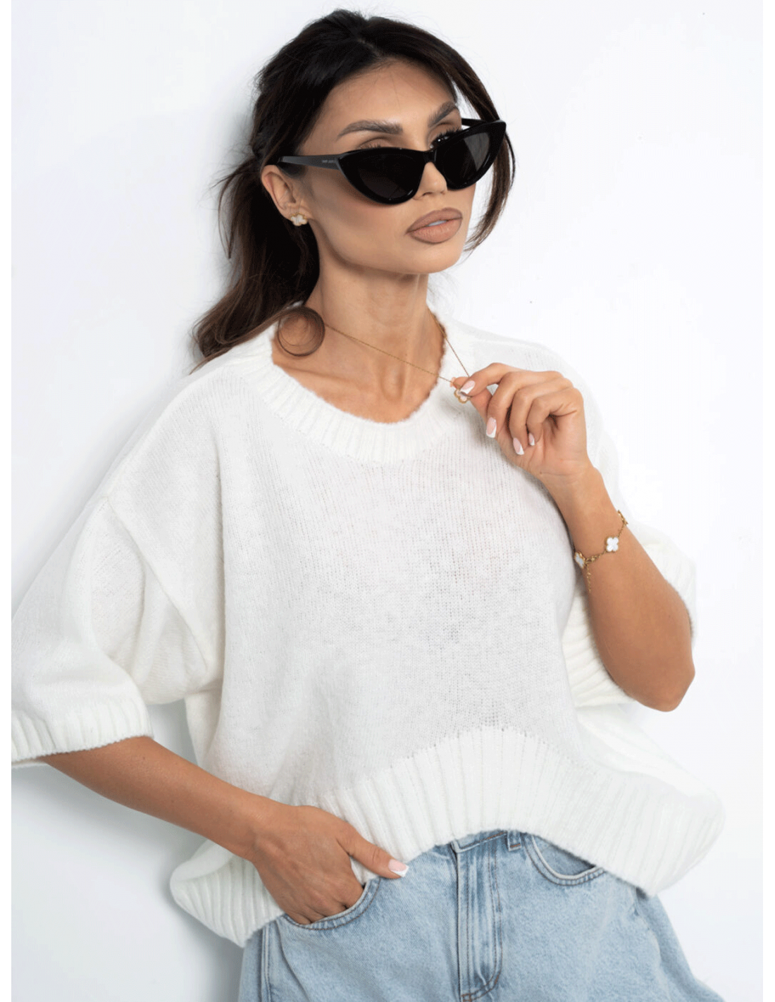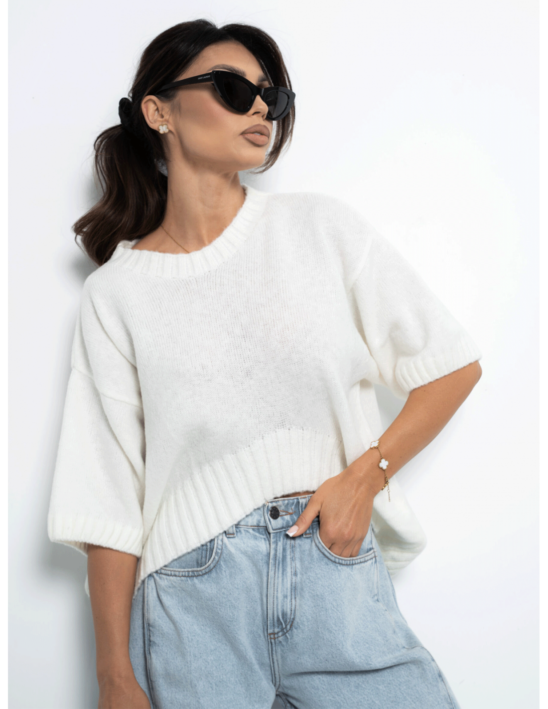 Modny sweter z krótkim rękawem LEANNA - biały